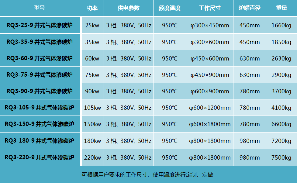 井式氣體滲碳爐 此設備可根據(jù)用戶要求進行定制、定做,服務熱線:13666533225 RQ3系列井式氣體滲碳爐(以下簡稱電爐)系周期作業(yè)式電爐,主要供碳鋼機件的氣體滲碳等用。與電爐控制柜配合使用可自動控制及自動記錄電爐的溫度。 一、開爐前準備工作 1、清除爐罐內(nèi)的碳黑,檢查密封襯墊。 2、檢查循環(huán)風扇、電動機,給軸承加潤滑脂、冷卻水套通水。 3、檢查熱電偶位置及油壓提升機構(gòu)。 4、檢查滴定器、甲醇、煤油儲存器。 二、開爐操作規(guī)程 1、合上電源開關(guān)。 2、調(diào)整儀表自動控制裝置正常后才允許通電升溫。 3、升溫時,開動風扇。 4、爐溫升到850℃時,開始滴入煤油(或甲醇)。 5、爐溫到需要溫度后,切斷爐子和風扇的電源,才能裝進工件。然后關(guān)緊爐門,接通風扇和爐子電源,按范圍操作。 6、工件出爐后,關(guān)緊爐蓋,繼續(xù)未動風扇,切斷爐子電阻絲電源,滴入少量煤油。 7、爐溫降至850℃時,停止滴入煤油。 8、爐溫降至600℃時,停止風扇,切斷電源開關(guān)。